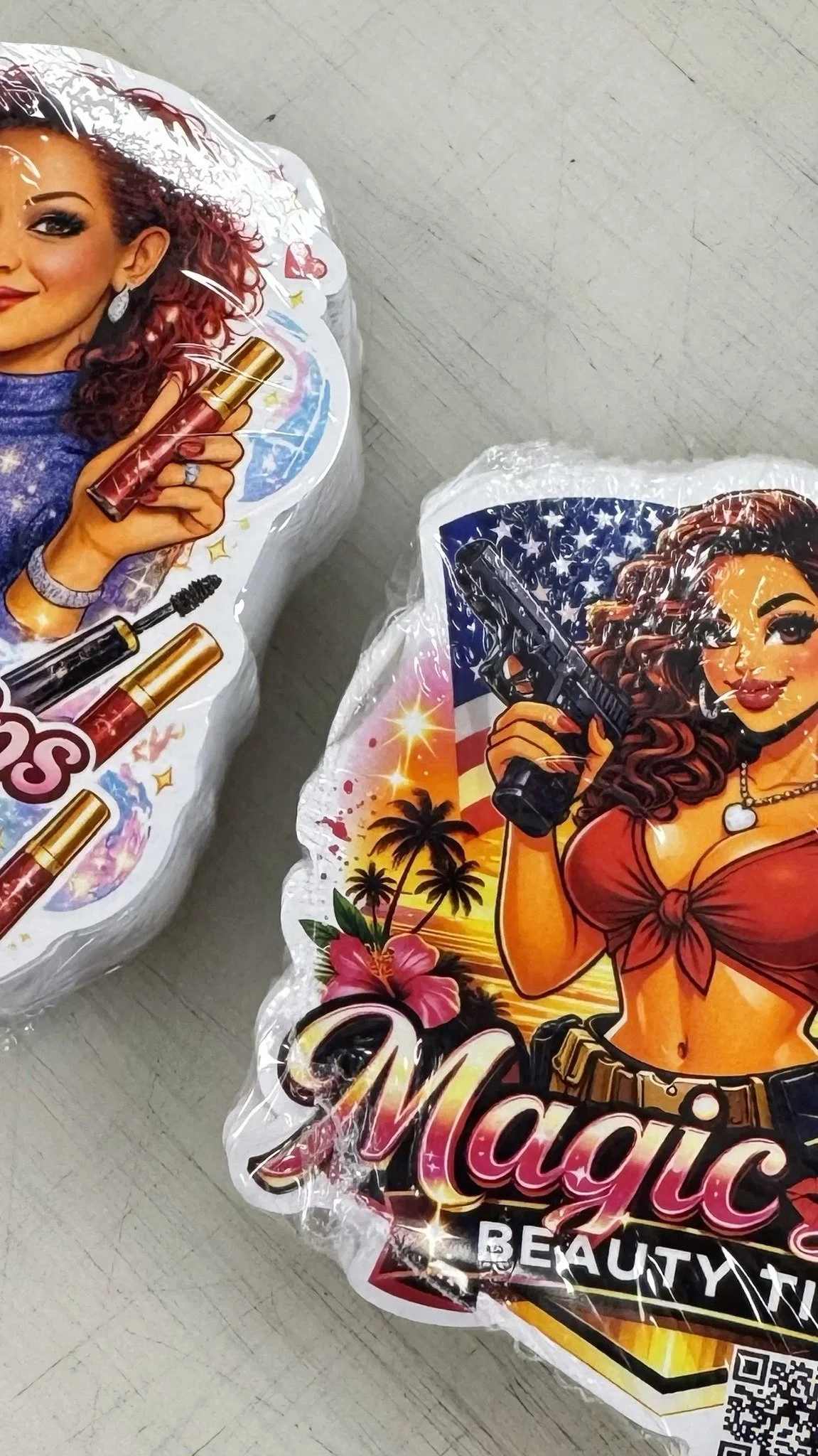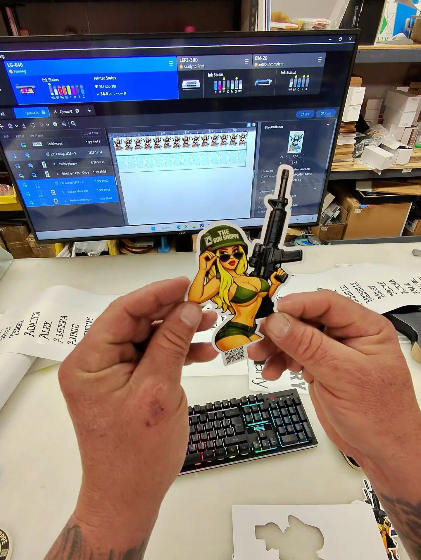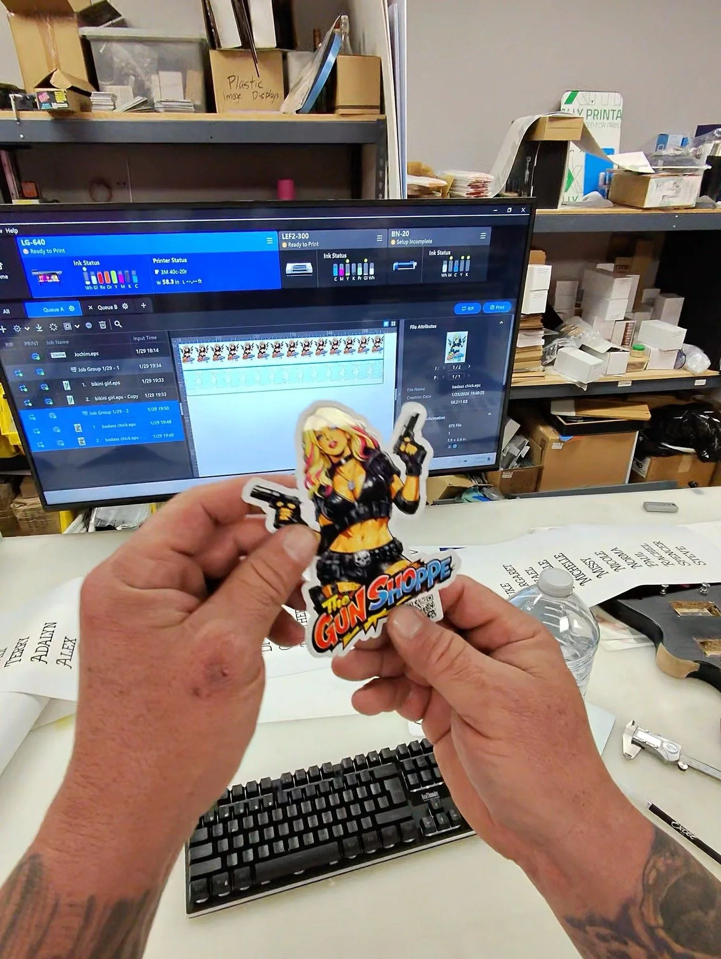 Custom stickers using superior UV printing technology, showcased on 3M vinyl material.